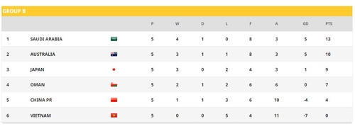 5위는 1승 1무 3패(승점 4)의 중국이다. 박항서 감독이 이끄는 베트남이 5전 전패로 최하위를 벗어나지 못하고 있다.