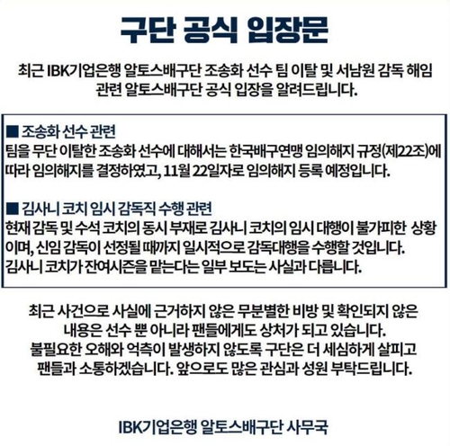 한편 IBK기업은행은 논란이 이는 김사니 코치의 임시 감독직 수행과 관련해 "현재 감독 및 수석 코치가 부재해 김사니 코치의 임시 대행이 불가피한 상황"이라며 "김사니 코치는 신임 감독이 선정될 때까지 일시적으로 감독대행을 수행하는 것이며 잔여 시즌을 맡는다는 일부 보도는 사실과 다르다"고 밝혔다.