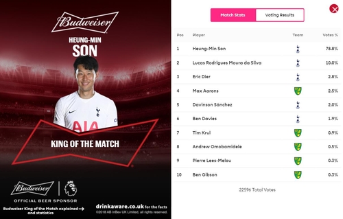 손흥민은 2만2천596명이 참여한 투표에서 78.8%의 압도적인 지지로 '킹 오브 더 매치'를 차지했다. 브렌트퍼드전에 이어 2경기 연속 '킹 오브 더 매치' 투표에서 당당히 1위에 올랐다.