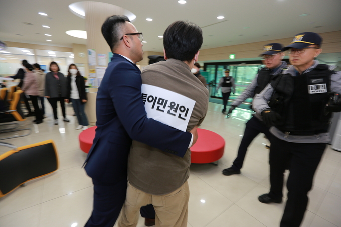 과천경찰서와 합동으로 실시된 이날 모의훈련에서는 민원 응대 과정에서 폭언·폭행, 기물파손 등 민원인의 위법 행위 발생 상황을 가정해 민원 대응 매뉴얼에 따라 민원인 진정 유도, 비상벨 작동, 경찰 출동, 민원인 제압 순으로 훈련을 진행했다.