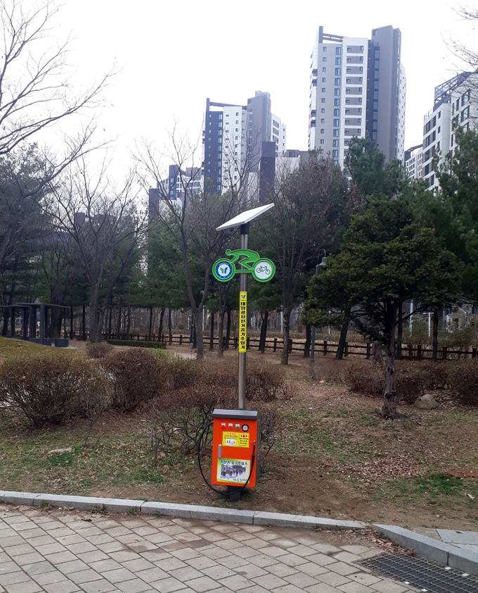 과천시 관내 중앙공원 현충탑을 비롯한 6개소에 태양광을 이용한 자전거 자동 공기주입기가 시범 설치됐다.