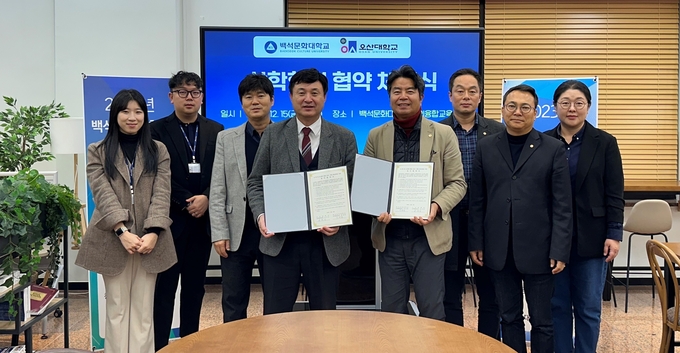 오산대학교와 백석문화대학교는 지난 15일 백석문화대 창조관 창의융합센터에서 ‘산·학·연·관 협력 공유·협업 활성화’를 위한 기업협업센터(ICC)간 업무협약을 체결했다고 21일 전했다.