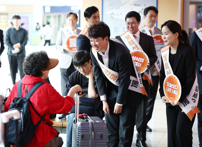 이준석 당대표 등 개혁신당은 ‘개혁신당과 함께 풍성한 한가위 되세요’라고 새겨진 어깨띠와 함께 ‘오늘보다 나은’이라고 적힌 손피켓을 들고 서울역을 찾아 귀성인사를 했다.