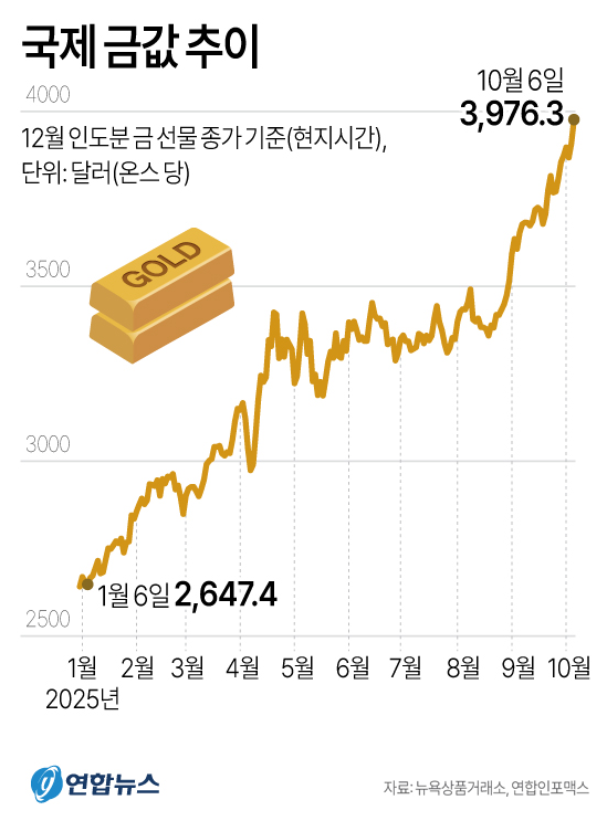 금값 연일 최고치 경신... 현물가격 4천달러 사상 첫 돌파