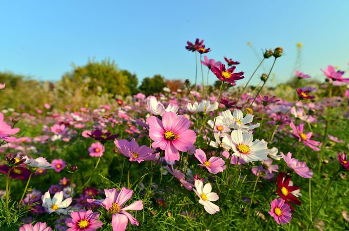 태평 습지생태원의 코스모스 길은 분홍, 아이보리, 자주빛 등 다채로운 색감으로 가을 하늘 아래 아름다운 풍경을 연출하고 있다.