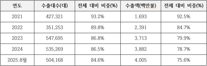같은 기간, 수출 대수 비중 역시 93.2%에서 84.6%로 줄었다.