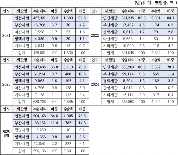 지난 8월 기준, 수출 차량 1대당 평균 단가는 인천항이 약 7944달러(약 1140만 원)인 반면 부산항은 1만 1469달러(약 1640만 원)로 44%나 더 높았다.