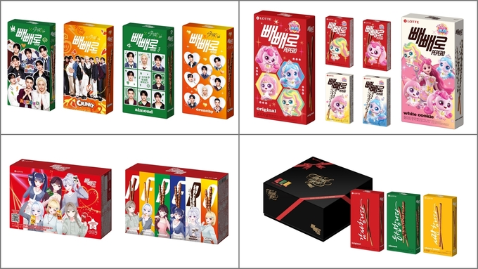 ‘캐치! 티니핑’ 협업 제품은 ‘빼빼로 초코’와 ‘빼빼로 화이트쿠키’ 2종으로, 시즌6 주인공 로열핑을 활용한 패키지 디자인이 특징이다. 또한 버추얼 아이돌 그룹 ‘이세계아이돌’ 온팩은 여섯 가지 정규 맛을 모두 담은 어쏘트 패키지로, 멤버별 포토카드도 함께 제공된다.
