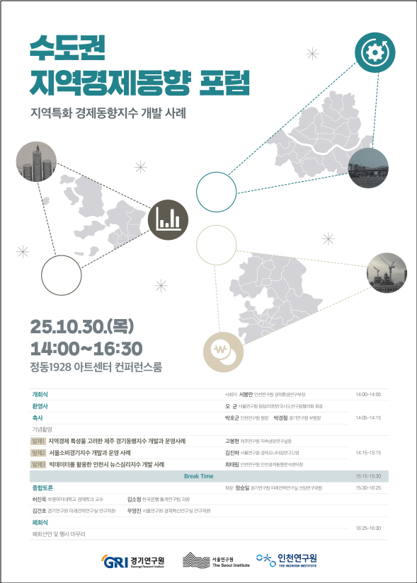 이번 포럼은 오는 30일 정동 1928 아트센터 컨퍼런스룸에서 ‘지역특화 경제동향지수 개발 사례’를 주제로 진행한다.