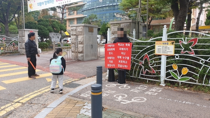 피해 학생의 학부모 B씨는 여러 차례 담임 교사와 상담을 진행했지만 뚜렷한 조치가 없자 지난 20일부터 학교 정문 앞에서 1인 피켓 시위를 벌이고 있다. 그러나 학교는 오히려 "정당한 교육활동을 침해했다"며 B씨를 교육 당국에 교권침해로 신고했다.