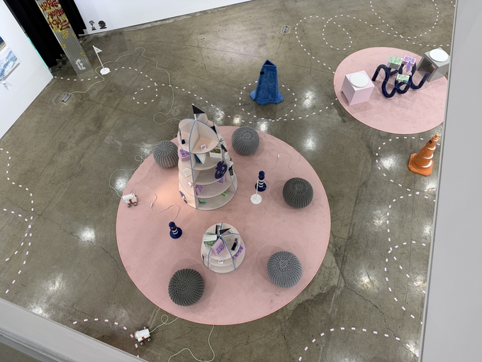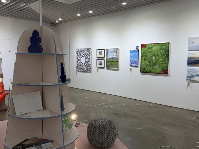 전시장 내부는 기존의 화이트 큐브 대신 라운지형 공간으로 꾸며졌다. 하얀 벽면에 일렬로 작품을 나열하기보다, 관람객이 자유롭게 거닐며 머물 수 있는 유희적 구조를 택했다.