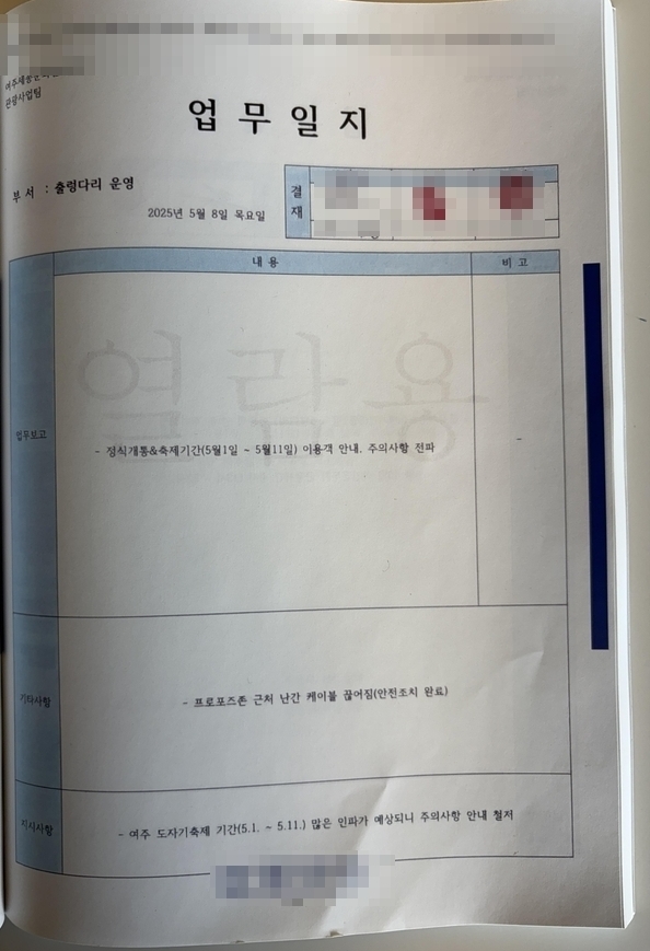 본지가 입수한 여주세종문화관광재단 업무일지에 따르면 같은 달 8일, 출렁다리 중간 ‘프로포즈 존’ 구간의 난간 케이블이 끊어졌다. 당시는 여주 도자기축제 기간으로 약 116만 명의 관광객이 몰린 시기였다. 사고 당시 추락 방지를 위한 케이블이 끊어지면서 자칫 대형 인명피해로 이어질 뻔했다.
