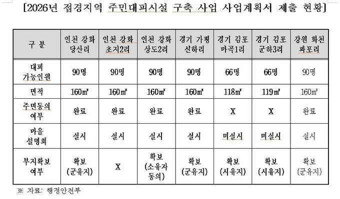 이같은 상황에도 불구하고 행안부는 지난 9월 대피시설 선정 절차를 통해 내년 총 7개소(경기3·인천3·강원1)로부터 주민대피시설 구축을 희망하는 사업계획서를 제출받았고, 적정성 심사 등을 통해 4개소를 사업대상으로 계획하고 있다.