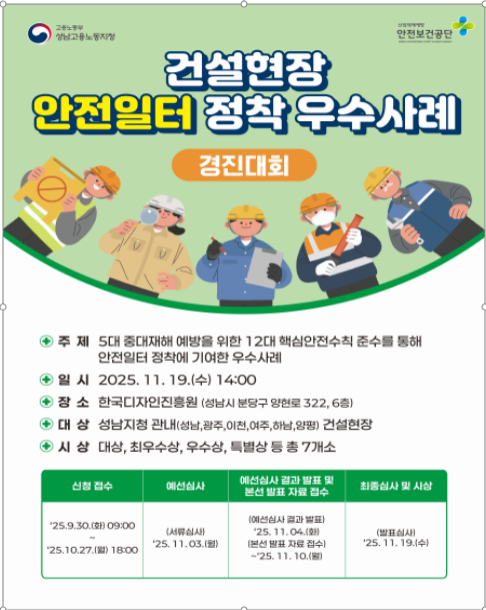 13일 고용노동부 성남지청은 5대 중대재해 예방을 위한 '건설현장 안전일터 정착 우수사례 경진대회'를 오는 19일 오후 2시에 성남 분당구 소재 한국디자인진흥원에서 개최한다고 밝혔다.