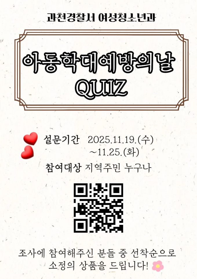 먼저 과천경찰서 민원실과 과천시청 민원실에 아동학대 예방 홍보물을 비치한다. 홍보물 내 QR코드를 이용하면 아동학대 기초정보를 알 수 있는 퀴즈를 풀 수 있다. 퀴즈에 참가한 시민에게는 소정의 상품이 제공된다.