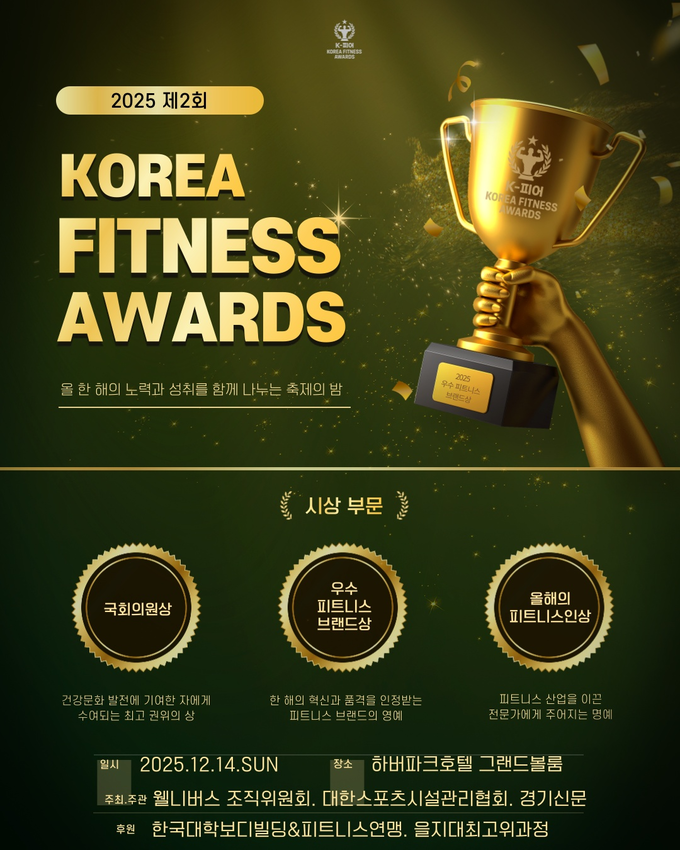 피트니스 분야에서 발군의 기량을 선보일 국내외 피트니스 종사자를 뽑는 대한민국 피트니스 어워즈(KFW)가 웰니버스 조직위원회, 대한스포츠시설관리협회, 경기신문 주최·주관으로 다음 달 14일 하버파크호텔에서 열린다.
