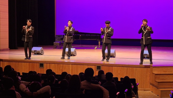 지난 21일 오전 10시쯤 인천학생교육문화회관 앞 광장. 100여명이 넘는 학생들이 학교 지도교사의 인솔을 받으며 1층 강당 안으로 들어섰다. 이들은 연화중학교 등 4곳의 학교 학생과 교사들로, 랍페라 콘서트 ‘감자팝콘’을 보기 위해 모였다. 싸리재홀(대공연장) 좌석을 빼곡히 채운 이들은 4명의 남성으로 구성된 랍페라그룹 ‘La Speranza’의 감미로운 목소리로 전하는 곡들마다 박수를 치며 크게 환호했다. 이 그룹은 영화 국가대표 OST ‘Butterfly’를 시작으로 앵콜곡까지 모두 12곡을 부르며 학생들과 소통했다.