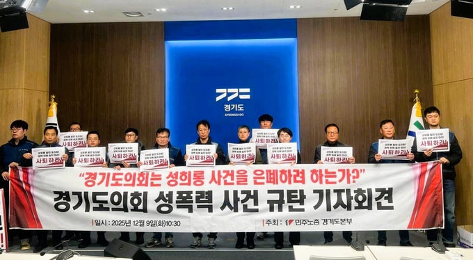 전국민주노동조합총연맹(민주노총) 경기도본부, 전국공무원노조 경기지역본부, 경기시민사회단체연대회의는 9일 “성희롱 가해 의원을 비호하며 사건을 방치한 김진경 경기도의회 의장은 즉각 책임지고 사퇴하라”고 강력 촉구했다.