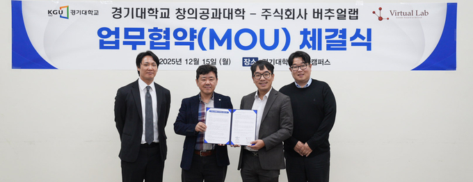 경기대에서 진행된 협약식에는 창의공과대학 장순웅 학장과 신소재공학전공 안계석 교수, 주식회사 버추얼랩 이민호 대표와 박민규 부사장 등 양 기관의 관계자들이 참석했다.