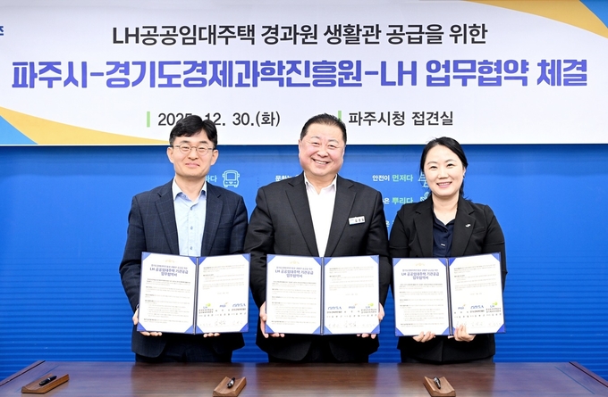 파주시는 지난달 30일 경기도경제과학진흥원, 한국토지주택공사 경기북부지역본부와 경과원 파주시 이전에 LH 공공임대주택 생활관 지원을 위한 업무협약을 체결했다고 1일 밝혔다.