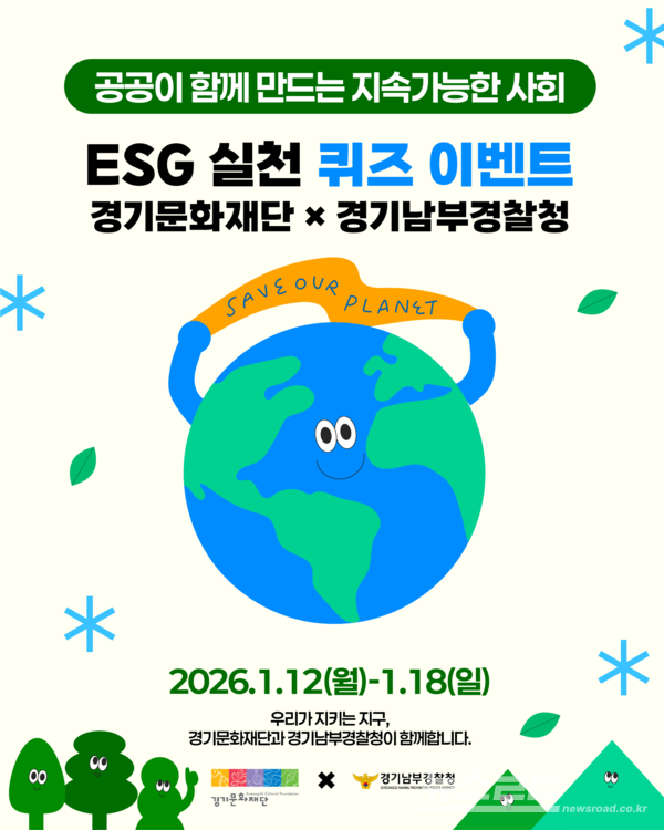 경기남부경찰청과 경기문화재단은 ESG(환경·사회·지배구조) 가치 확산을 위해 오는 12일부터 18일까지 소셜네트워크서비스(SNS) 퀴즈 이벤트를 공동으로 진행한다고 밝혔다.