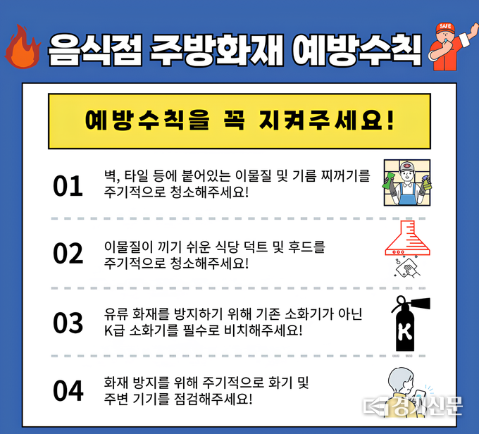 안성소방서는 겨울철 음식점 화재 예방을 위해 ▲주방 내 가스레인지 주변에 소화기 및 K급 소화기 비치 ▲동·식물성 기름 제거가 가능한 필터 설치 ▲자동확산소화장치 및 가스차단기 설치 ▲노후 전선 교체 등 기본적인 안전수칙 준수를 강조했다.