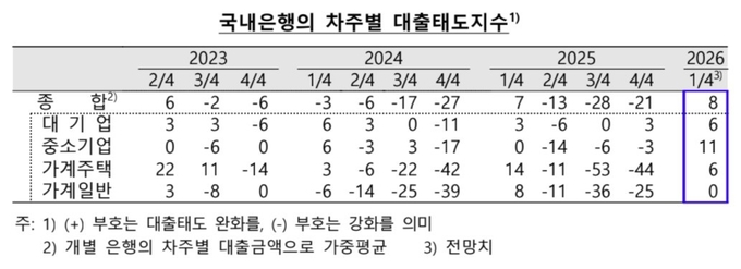 한은 관계자는 "새해 대출 취급 재개로 주택 관련 가계대출 중심으로 전 분기보다는 완화 전망"이라며 "대기업은 완화적 대출태도가 유지, 중소기업은 완화될 것"이라고 말했다.