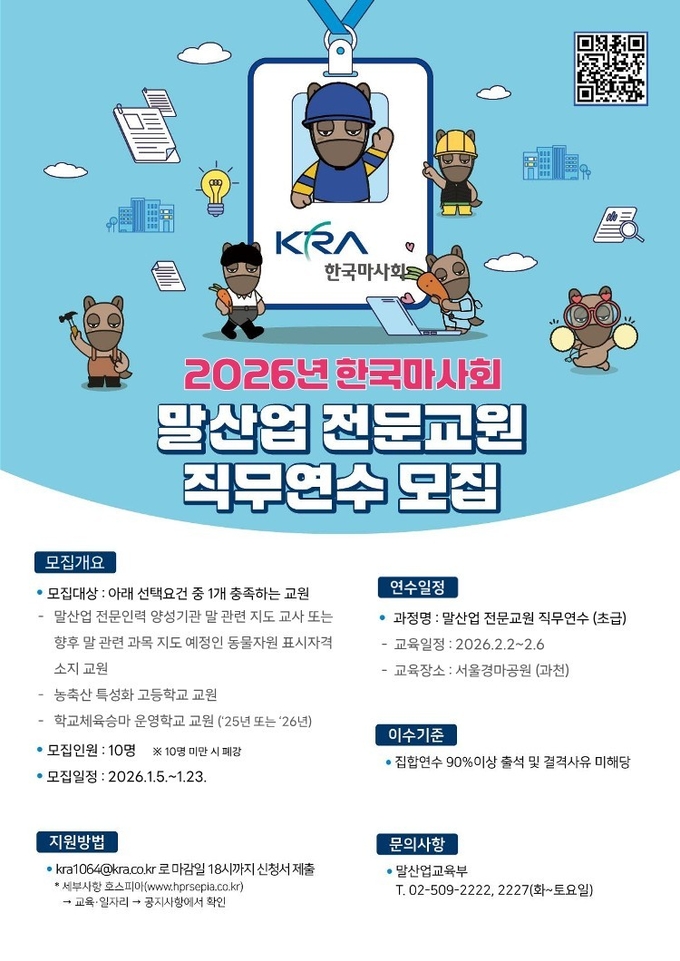 한국마사회가 다음 달 진행 예정인 말산업 전문교원 직무연수의 참가자를 오는 23일까지 모집한다.