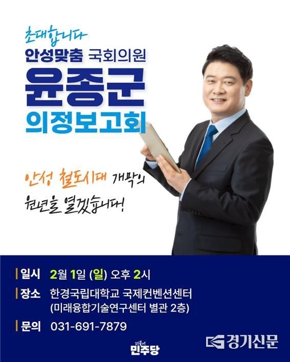 윤종군(민주·안성) 국회의원이 다음 달 1일 오후 2시, 한경국립대학교 컨벤션센터에서 의정보고회를 열고 지난 1년간의 의정활동 성과를 시민들에게 직접 보고한다.