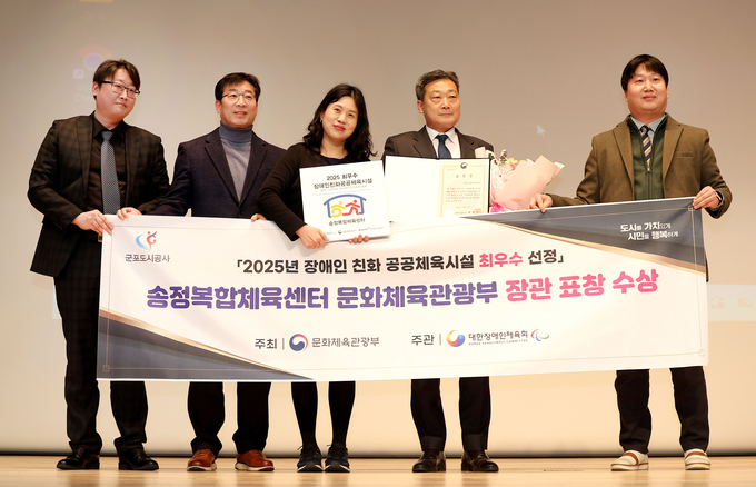 군포도시공사가 운영하는 송정복합체육센터가 최근 대한장애인체육회 이천선수촌에서 열린 ‘2025년 장애인 이용편의 우수체육시설 시상식’에서 ‘최우수 체육시설’로 선정되어 문화체육관광부 장관 표창을 수상했다고 21일 밝혔다.