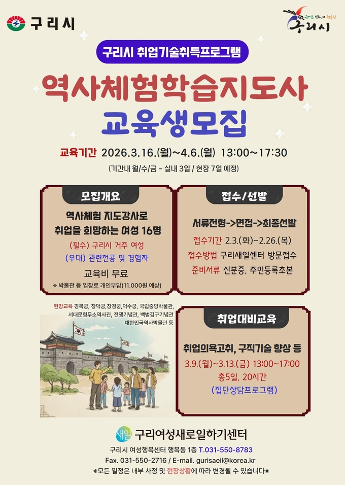 구리시는 구리새일센터에서 구리시 거주 여성을 대상으로 운영하는 ‘2026년 취업 기술 취득프로그램’ 가운데 역사 체험학습 지도사 과정 교육생을 다음 달 3일부터 모집한다고 밝혔다.