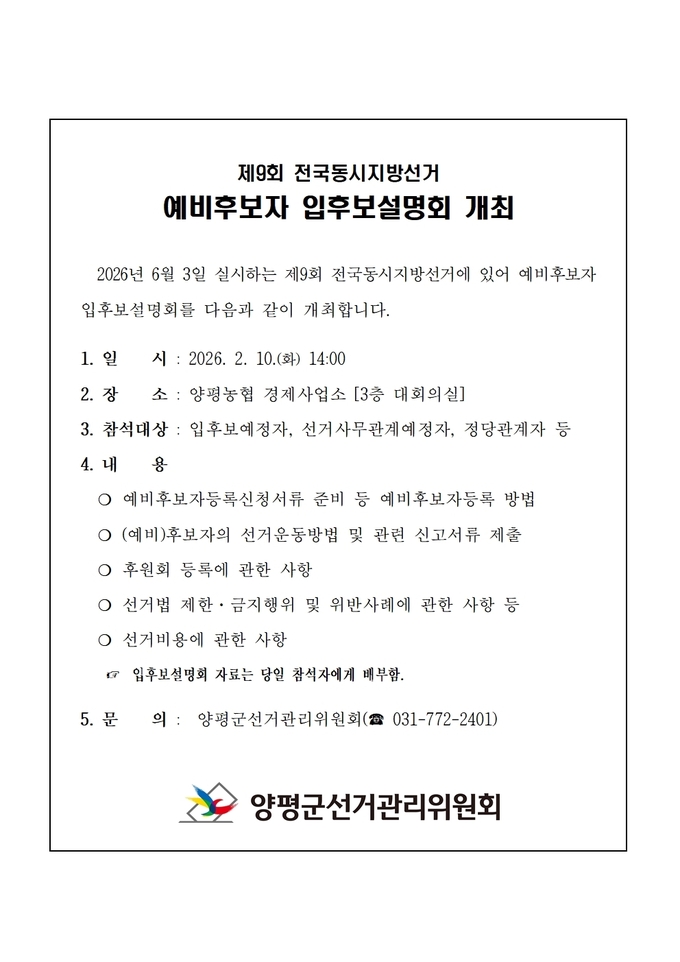 양평군선거관리위원회는 2월 10일 오후 2시 양평농헙 경제사업소 3층 대회의실에서 6·3 전국동시지방선거와 관련해 입후보예정자들에게 (예비)후보자등록 및 선거운동방법 등에 관한 '예비후보자 입후보설명회'를 개최한다고 26일 밝혔다.