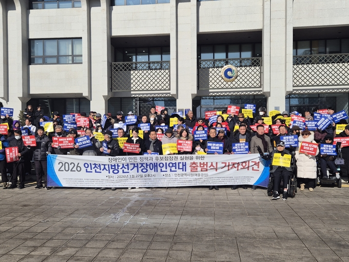 인천 31개 장애인단체는 27일 인천시청 앞에서 '2026 인천지방선거장애인연대' 출범식을 열었다.