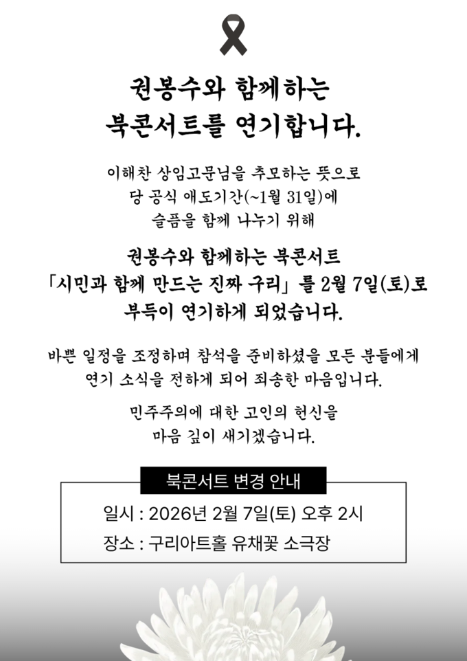 권봉수 구리시의원이 고(故) 이해찬 민주평화통일자문회의 수석부의장에 대한 추모의 뜻으로, 오는 31일 열 예정이던 북콘서트를 2월 7일로 연기했다.