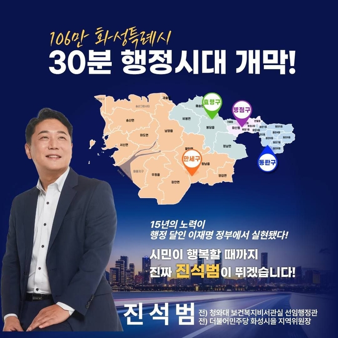 진석범 화성특례시장 출마예정자는 최근 화성특례시 만세구·효행구·병점구·동탄구 등 4개 구청 체제의 공식 출범과 관련해 “시민의 오랜 염원이었던 4개 구청 체제 출범을 환영한다”며 “행정편의가 아닌 시민편의 중심으로 운영돼야 한다”고 밝혔다.