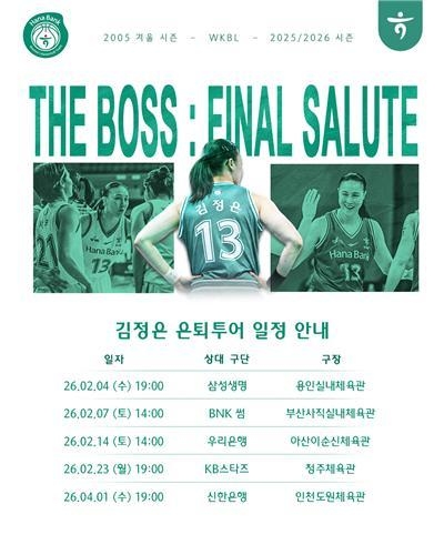 하나은행은 "김정은 선수가 이번 시즌을 끝으로 은퇴한다. 이에 WKBL 역사상 최초로 은퇴 투어를 진행한다"고 3일 밝혔다.