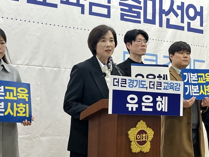 유은혜 전 사회부총리 겸 교육부 장관이 4일 경기도의회 브리핑룸에서 기자회견을 열고 오는 6월 경기도교육감 선거 출마를 공식 선언했다.