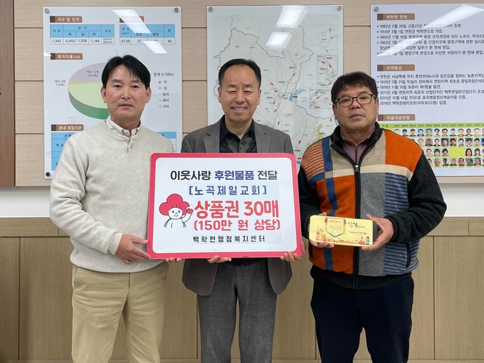 연천군 백학면 노곡제일교회는 지난 4일 백학면행정복지센터를 방문해 설 명절을 맞아 소외계층에게 전달해달라며 농촌사랑상품권 150만 원을 기탁했다.