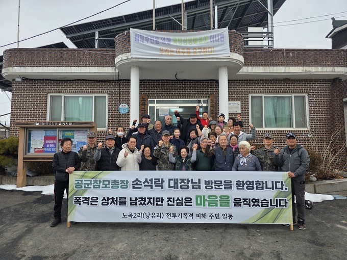 지난 4일 손석락(중장) 공군참모총장과 공군부대 관계자들은 지난해 4월 당시 전투기 오폭 사고 피해지역인 포천시 노곡2리 마을을 찾아 전투기폭격피해배상투쟁위원회 등 주민 간담회를 개최했다.