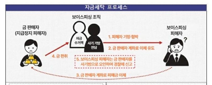 이 과정에서 보이스피싱 피해자가 피해 사실을 인지해 금 판매자를 사기범으로 신고하면 금 판매자는 '사기이용계좌 명의인'으로 분류돼 금융거래가 제한되는 2차 피해까지 입을 수 있다.