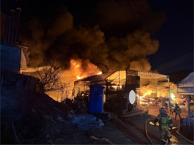 이날 소방대원들은 화재가 바람을 타고 인근으로 번지는 것을 막기 위해 바람이 불어오는 방향에 불을 뿌리는 등 진화에 큰 어려움을 겪었다.