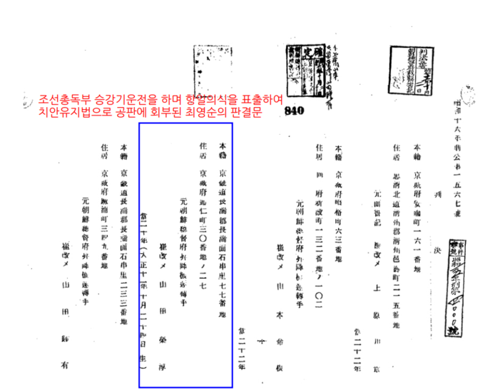 이외에도 조선총독부 승강기 운전수로 근무하며 화장실 벽에 ‘대한독립 만세’를 쓰고 태극기를 그려 넣는 등 항일 의식을 선전하다 체포된 장단 출신 최영순, 총독부 체신국에서 비밀결사를 조직하려다 발각돼 징역형을 선고받은 용인 출신 한붕교 등 다양한 분야의 저항운동가가 발굴됐다.