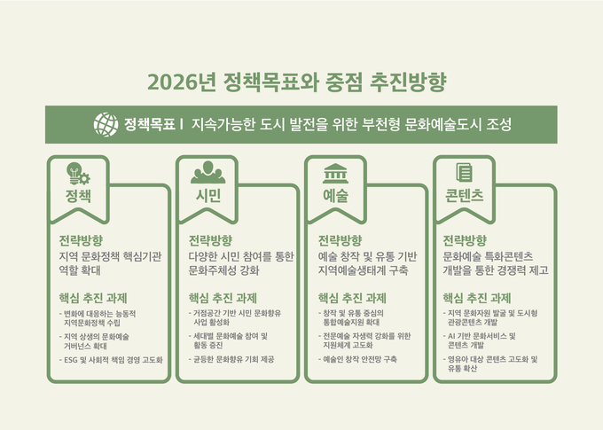 올해 재단의 정책 목표는 ‘지속가능한 도시 발전을 위한 부천형 문화예술도시 조성’이다. 이를 위해 ▲시민 참여형 문화예술 확대 ▲지역 예술가의 안정적 창작 기반 강화 ▲생활권 문화공간 중심의 동네 문화 확산 ▲행정·상인·학교·대학 간 협력 거버넌스 구축 등을 주요 방향으로 제시했다.