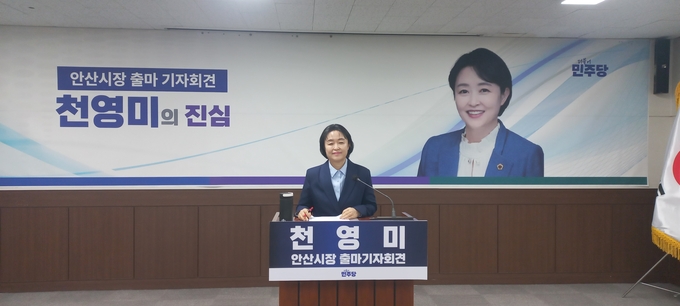 경기도의원을 역임한 천 위원은 이날 안산시의회 대회의실에서 기자회견을 열고 “지방자치는 정치가 아니라 일이다. ‘안산에 산다는 것이 자랑스럽다’고 말할 수 있는 도시를 만들기 위해 정치꾼의 시대를 끝내고 실력으로 증명하는 시장이 돼 안산의 대역전극을 시작하겠다”고 포부를 밝혔다.