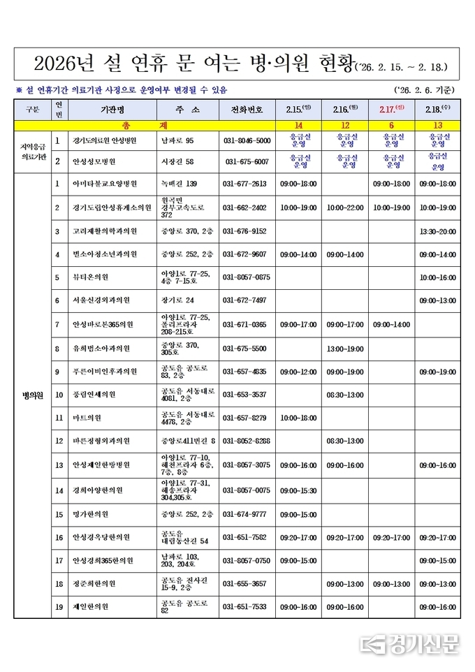 설 연휴 기간 문 여는 병·의원과 약국 정보는 공동주택 게시판을 비롯해 보건복지부 콜센터(129), 구급상황관리센터(119), 경기도 콜센터(120)를 통해 확인할 수 있다. 온라인에서는 응급의료포털(www.e-gen.or.kr)과 스마트폰 애플리케이션 ‘응급똑똑’, 안성시청 및 안성시 보건소 누리집에서도 관련 정보를 제공한다.