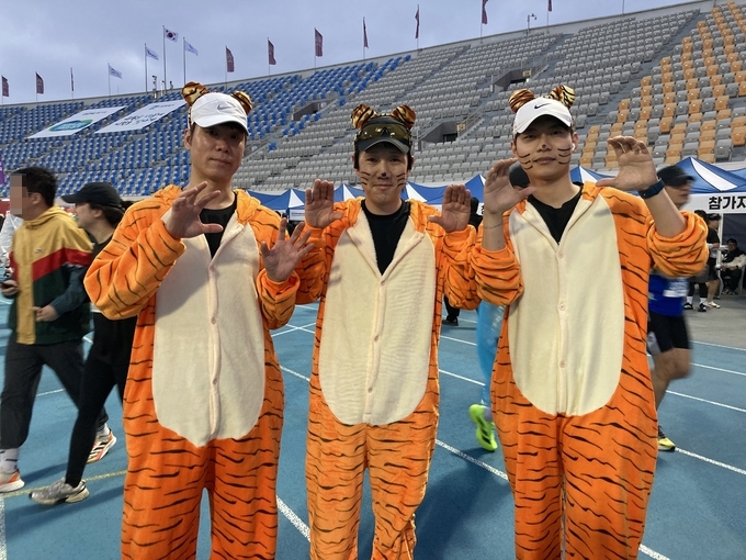 호랑이 털옷과 머리띠까지 갖춰 입은 김수진 씨, 왕경수 씨, 조성일 씨는 평택 LG전자 칠러공장 사내 동호회 회원들로 함께 10㎞ 코스에 참가했다.