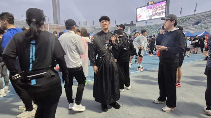 수원시 영화동에서 거주하는 29세 김성훈(1998년)씨는 22일 수원종합운동장에서 열린 2026 경기수원국제하프마라톤 대회에 쿠팡에서 구매한 검도복 차림으로 참가해 눈길을 끌었다.