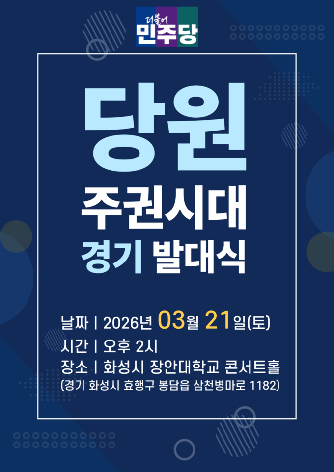 더불어민주당이 다음 달 21일 오후 2시 장안대학교 콘서트홀(효행구 봉담읍)에서 ‘당원주권시대 경기발대식’을 연다.
