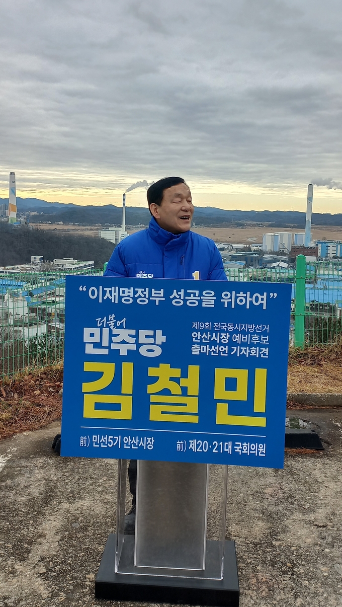 민선 5기 안산시장과 재선 국회의원을 역임한 더불어민주당 김철민 안산시장 예비후보가 3일 오전 반월국가산업단지 안산스마트허브 전망대 앞에서 기자회견을 열고 6·3지방선거 안산시장 출마를 공식 선언했다.
