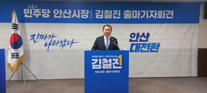 김철진 더불어민주당 정책위원회 부의장이 4일 오전 11시 안산시의회 대회의실에서 기자회견을 열어 6·3 지방선거 안산시장 출마를 공식 선언했다.